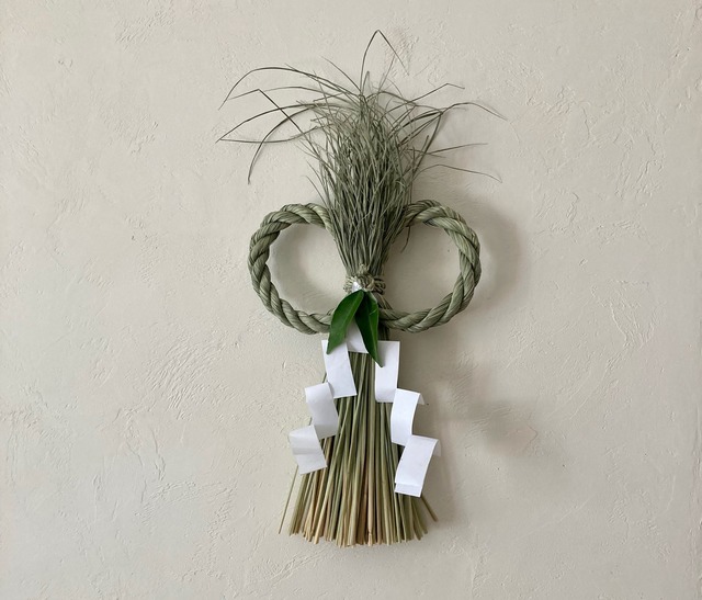 人気の定番しめかざり「メガネ」を今年も販売します。 メガネは「先を見通せるように」と願いを込めて作られるかたちで、京都・兵庫・岡山・広島など西日本で見られるしめかざりです。不透明な時代だからこそ、よーく先のことが見通せるように願うのもいいかもしれません。葉先はお好みで、ハサミで切り揃えることもできます。 ユニークなかたちで、贈り物としても喜ばれます。 飾り用に、清浄を表す紙垂(しで)と、ゆずり葉をおつけします。ゆずり葉は若葉が出てから譲るように葉を落とすことから、家が代々続くことを表す縁起物です。時間と共に枯れてきますが、その変化する姿もお楽しみいただけたらと思います。 作り手は、栃木県のしめ縄農家の小林さん。酉の市で販売されるしめ縄や、神社での10mものしめ縄の制作も手がけるプロフェッショナルです。しめ縄のために、小林さんが自ら苗から育てた青藁を使用したしめかざりは、深呼吸したくなるような青藁の清々しい香り。 お正月を迎えるのにぴったりの、青く香り高いメガネのしめかざりで、どうぞ良いお年をお迎えください。 サイズ:約50cm(縦)×約26cm(横) ※紙垂・ゆずり葉つき(ご自分で飾りつけして仕上げていただきます) ※全て一点ずつ手作りですので、大きさや色味には多少の個体差があります。ご了承ください。 ※紫外線や温度、湿度などで状態がゆっくり変化しますが、自然のものとしてお楽しみください。 ※配送は、入金確認後に12月20日過ぎに順次行います。